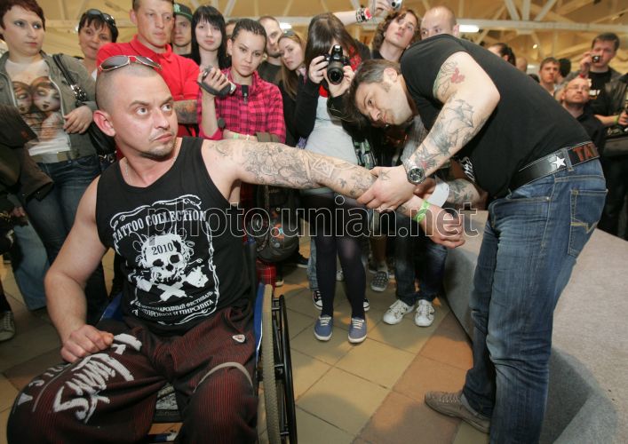 Участник VI Международного фестиваля тату и пирсинга «Tattoo- Collection/2010» демонстрирует татуировку в Киеве, в пятницу, 21 мая 2010 г. Ежегодный фестиваль татуировки и пирсинга – это площадка, где соревнуются в своём умении десятки мастеров, собираются тысячи любителей и почитателей этого искусства, а также производится выставка-продажа оборудования для тату и пирсинга как отечественных, так и зарубежных фирм-производителей. Фото Владимира Гонтара / УНИАН