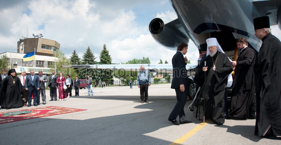 Предстоятель Украинской Православной Церкви Митрополит Киевский и всей Украины Владимир, третий справа, во время прибытия в Запорожье, в пятницу, 21 мая 2010 г. В этот день митрополит Владимир прибыл с двухдневным визитом в Запорожье. Он встретился с председателем облгосадминистрации и первым заместителем председателя областного совета. Во время встречи было подписано соглашение о социальном партнерстве между Запорожской епархией Украинской Православной церкви, Запорожской областной государственной администрацией и Запорожским областным советом. Соглашение предусматривает сотрудничество в сфере общественных, гражданских, патриотических и семейных ценностей, образования, исторического и культурного наследия, развития украинского казачества. Фото Александра Прилепы / УНИАН