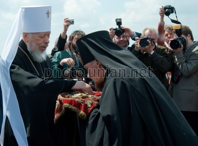 Предстоятель Украинской Православной Церкви Митрополит Киевский и всей Украины Владимир, слева, во время прибытия в Запорожье, в пятницу, 21 мая 2010 г. В этот день митрополит Владимир прибыл с двухдневным визитом в Запорожье. Он встретился с председателем облгосадминистрации и первым заместителем председателя областного совета. Во время встречи было подписано соглашение о социальном партнерстве между Запорожской епархией Украинской Православной церкви, Запорожской областной государственной администрацией и Запорожским областным советом. Соглашение предусматривает сотрудничество в сфере общественных, гражданских, патриотических и семейных ценностей, образования, исторического и культурного наследия, развития украинского казачества. Фото Александра Прилепы / УНИАН