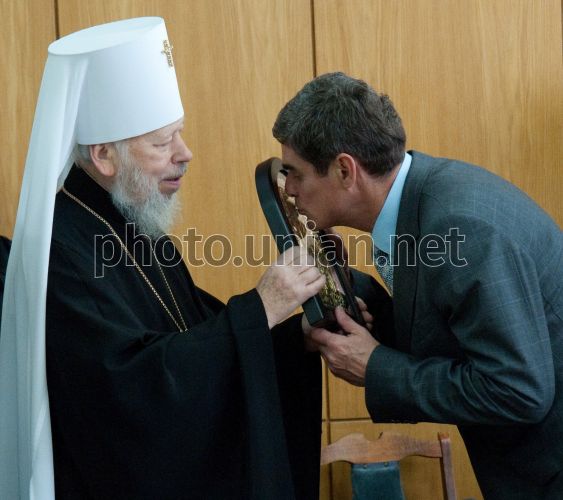 Председатель Запорожской областной государственной администрации Борис Петров, справа, прикладывается к иконе во время встречи с предстоятелем Украинской Православной Церкви Митрополитом Киевским и всей Украины Владимиром в Запорожье, в пятницу, 21 мая 2010 г. В этот день митрополит Владимир прибыл с двухдневным визитом в Запорожье. Он встретился с председателем облгосадминистрации и первым заместителем председателя областного совета. Во время встречи было подписано соглашение о социальном партнерстве между Запорожской епархией Украинской Православной церкви, Запорожской областной государственной администрацией и Запорожским областным советом. Соглашение предусматривает сотрудничество в сфере общественных, гражданских, патриотических и семейных ценностей, образования, исторического и культурного наследия, развития украинского казачества. Фото Александра Прилепы / УНИАН