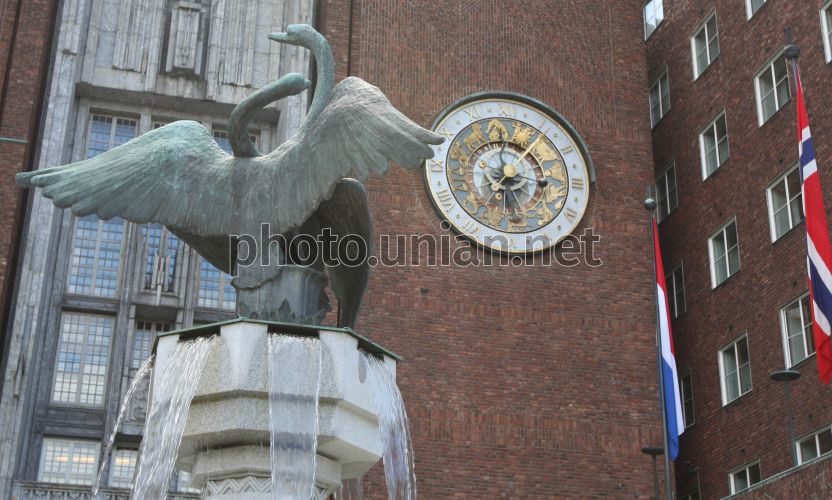 Фонтан в виде двух лебедей и астрономические часы на здании городской ратуши, в Осло (Норвегия), во вторник, 1 июня 2010 г. Фото УНИАН