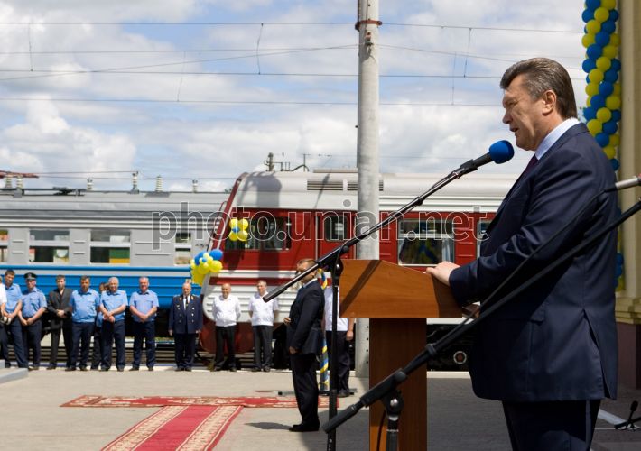 Президент Украины Виктор Янукович выступает во время церемонии открытия электрифицированного участка «Конотоп-Ворожба» Юго-Западной железной дороги и обновленного железнодорожного вокзала «Ворожба» в городе Ворожба, Белопольского р-на Сумской обл., в четверг, 17 июня 2010 г. Во время торжеств гости мероприятия отправили в первый рейс электропоезд повышенного комфорта № 818/817 сообщением «Ворожба-Киев». Расстояние до столицы новый электропоезд преодолевает за четыре часа. Фото Михаила Маркива /POOL /УНИАН