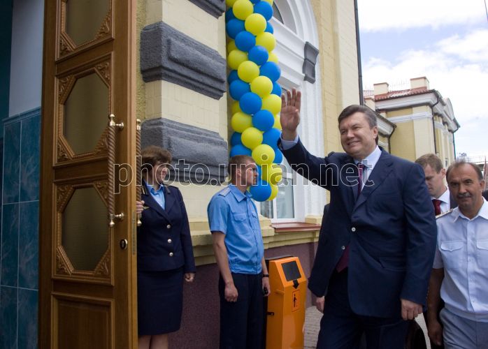 Президент Украины Виктор Янукович, второй справа, и начальник Юго-Западной железной дороги Алексей Кривопишин, справа, во время церемонии открытия электрифицированного участка «Конотоп-Ворожба» Юго-Западной железной дороги и обновленного железнодорожного вокзала «Ворожба» в городе Ворожба, Белопольского р-на Сумской обл., в четверг, 17 июня 2010 г. Во время торжеств гости мероприятия отправили в первый рейс электропоезд повышенного комфорта № 818/817 сообщением «Ворожба-Киев». Расстояние до столицы новый электропоезд преодолевает за четыре часа. Фото Михаила Маркива /POOL /УНИАН