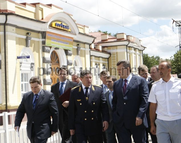 Президент Украины Виктор Янукович, второй справа, и начальник Юго-Западной железной дороги Алексей Кривопишин, справа, во время церемонии открытия электрифицированного участка «Конотоп-Ворожба» Юго-Западной железной дороги и обновленного железнодорожного вокзала «Ворожба» в городе Ворожба, Белопольского р-на Сумской обл., в четверг, 17 июня 2010 г. Во время торжеств гости мероприятия отправили в первый рейс электропоезд повышенного комфорта № 818/817 сообщением «Ворожба-Киев». Расстояние до столицы новый электропоезд преодолевает за четыре часа. Фото Андрея Мосиенко / POOL / УНИАН