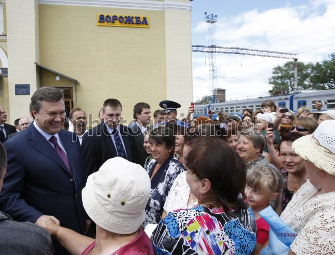 Президент Украины Виктор Янукович, слева, во время церемонии открытия электрифицированного участка «Конотоп-Ворожба» Юго-Западной железной дороги и обновленного железнодорожного вокзала «Ворожба» в городе Ворожба, Белопольского р-на Сумской обл., в четверг, 17 июня 2010 г. Во время торжеств гости мероприятия отправили в первый рейс электропоезд повышенного комфорта № 818/817 сообщением «Ворожба-Киев». Расстояние до столицы новый электропоезд преодолевает за четыре часа. Фото Андрея Мосиенко / POOL / УНИАН