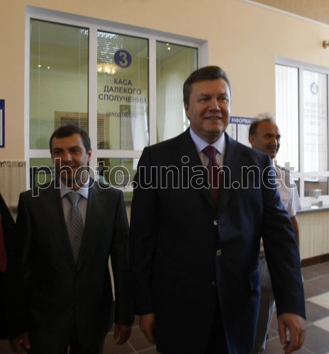 Президент Украины Виктор Янукович, справа, во время церемонии открытия электрифицированного участка «Конотоп-Ворожба» Юго-Западной железной дороги и обновленного железнодорожного вокзала «Ворожба» в городе Ворожба, Белопольского р-на Сумской обл., в четверг, 17 июня 2010 г. Во время торжеств гости мероприятия отправили в первый рейс электропоезд повышенного комфорта № 818/817 сообщением «Ворожба-Киев». Расстояние до столицы новый электропоезд преодолевает за четыре часа. Фото Андрея Мосиенко / POOL / УНИАН