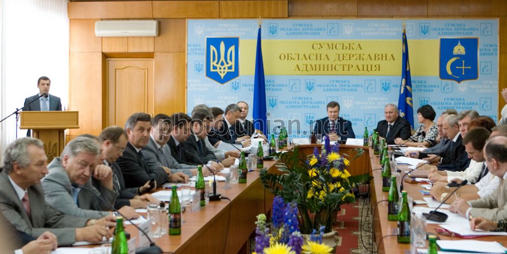Президент Украины Виктор Янукович, в центре, на расширенном заседании Сумского регионального комитета по экономическим реформам, в Сумах, в четверг, 17 июня 2010 г. В ходе заседания Президент Украины поручил на законодательном уровне решить, чтобы на экологически загрязненных территориях оставались средства от экологических сборов. Обращаясь к министру топлива и энергетики, Президент подчеркнул, что регион, страдающий экологически из-за производства нефти и газа, должен получать как минимум 5% в местный бюджет от работы того или другого предприятия, занимающегося добычей газа и нефти. Кроме того, Президент попросил министра экологии рассмотреть вопрос по поводу того, чтобы часть средств от экологических сборов также должна оставаться на местах. При этом Президент отметил, что необходимо решать этот вопрос системно, по всем территориям, где есть экологические проблемы вследствие добычи газа и нефти. Президент подчеркнул, что это должно быть решено на уровне законодательства. Фото Михаила Маркива /POOL /УНИАН