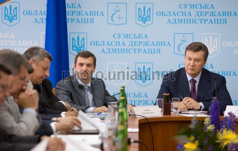Министр топлива и энергетики Украины Юрий Бойко, слева, председатель Сумской областной государственной администрации Юрий Чмырь, второй справа, и Президент Украины Виктор Янукович, в центре, на расширенном заседании Сумского регионального комитета по экономическим реформам, в Сумах, в четверг, 17 июня 2010 г. В ходе заседания Президент Украины поручил на законодательном уровне решить, чтобы на экологически загрязненных территориях оставались средства от экологических сборов. Обращаясь к министру топлива и энергетики, Президент подчеркнул, что регион, страдающий экологически из-за производства нефти и газа, должен получать как минимум 5% в местный бюджет от работы того или другого предприятия, занимающегося добычей газа и нефти. Кроме того, Президент попросил министра экологии рассмотреть вопрос по поводу того, чтобы часть средств от экологических сборов также должна оставаться на местах. При этом Президент отметил, что необходимо решать этот вопрос системно, по всем территориям, где есть экологические проблемы вследствие добычи газа и нефти. Президент подчеркнул, что это должно быть решено на уровне законодательства. Фото Михаила Маркива /POOL /УНИАН