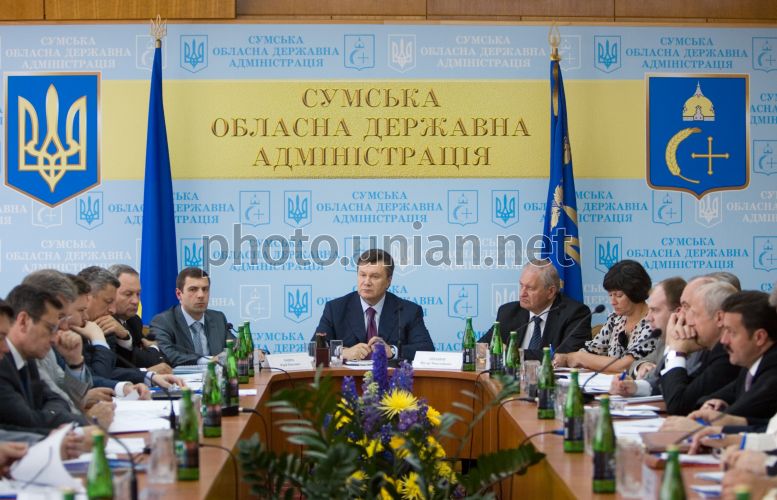 Председатель Сумской областной государственной администрации Юрий Чмырь, слева на заднем плане, Президент Украины Виктор Янукович, в центре, вице-премьер-министр Украины по вопросам региональной политики Виктор Тихонов и первый заместитель Главы Администрации Президента Украины, представитель Президента Украины в Кабинете Министров Ирина Акимова на расширенном заседании Сумского регионального комитета по экономическим реформам, в Сумах, в четверг, 17 июня 2010 г. В ходе заседания Президент Украины поручил на законодательном уровне решить, чтобы на экологически загрязненных территориях оставались средства от экологических сборов. Обращаясь к министру топлива и энергетики, Президент подчеркнул, что регион, страдающий экологически из-за производства нефти и газа, должен получать как минимум 5% в местный бюджет от работы того или другого предприятия, занимающегося добычей газа и нефти. Кроме того, Президент попросил министра экологии рассмотреть вопрос по поводу того, чтобы часть средств от экологических сборов также должна оставаться на местах. При этом Президент отметил, что необходимо решать этот вопрос системно, по всем территориям, где есть экологические проблемы вследствие добычи газа и нефти. Президент подчеркнул, что это должно быть решено на уровне законодательства. Фото Михаила Маркива /POOL /УНИАН