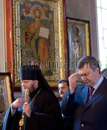 Президент Украины Виктор Янукович, справа, во время посещения Кафедрального Спасо-Преображенского собора в Сумах, в четверг, 17 июня 2010 г. В этот день Виктор Янукович посетил Сумскую область с рабочим визитом. Фото Михаила Маркива / POOL / УНИАН