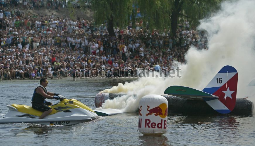 Участники команды ”Сигара Хуана” во время 1-го турнира Red Bull Flugtag - День безумных полетов, в Киеве, в субботу, 19 июня 2010 г. Суть данного мероприятия состоит в том, что сначала все его участники сооружают себе безмоторный летательный аппарат и прыгают на нем с 6-ти метрового трамплина, тем самым, пытаясь взлететь и пролететь, как можно дальше своих соперников. Приземляются участники на воду. Фото Александра Синицы / УНИАН