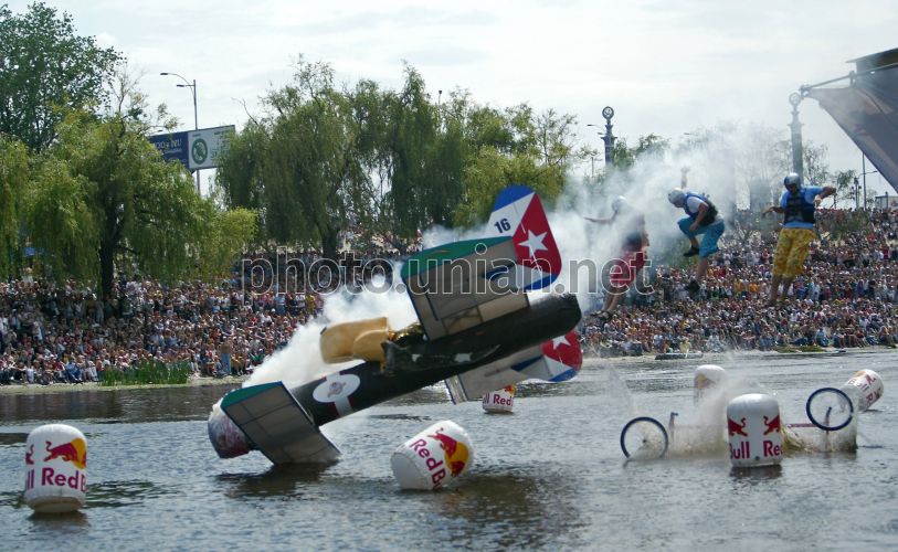 Участники команды ”Сигара Хуана” во время 1-го турнира Red Bull Flugtag - День безумных полетов, в Киеве, в субботу, 19 июня 2010 г. Суть данного мероприятия состоит в том, что сначала все его участники сооружают себе безмоторный летательный аппарат и прыгают на нем с 6-ти метрового трамплина, тем самым, пытаясь взлететь и пролететь, как можно дальше своих соперников. Приземляются участники на воду. Фото Александра Синицы / УНИАН