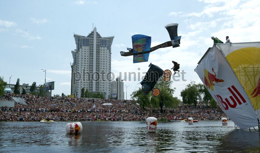 Участники команды ”Fling axe” во время 1-го турнира Red Bull Flugtag - День безумных полетов, в Киеве, в субботу, 19 июня 2010 г. Суть данного мероприятия состоит в том, что сначала все его участники сооружают себе безмоторный летательный аппарат и прыгают на нем с 6-ти метрового трамплина, тем самым, пытаясь взлететь и пролететь, как можно дальше своих соперников. Приземляются участники на воду. Фото Александра Синицы / УНИАН
