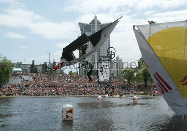 Участники команды ”Пингвины Киевского зоопарка” во время 1-го турнира Red Bull Flugtag - День безумных полетов, в Киеве, в субботу, 19 июня 2010 г. Суть данного мероприятия состоит в том, что сначала все его участники сооружают себе безмоторный летательный аппарат и прыгают на нем с 6-ти метрового трамплина, тем самым, пытаясь взлететь и пролететь, как можно дальше своих соперников. Приземляются участники на воду. Фото Александра Синицы / УНИАН