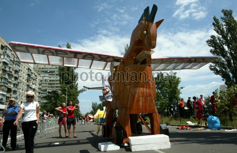 Летательный аппарат команды ”Cпарта” перед началом выступления во время 1-го турнира Red Bull Flugtag - День безумных полетов, в Киеве, в субботу, 19 июня 2010 г. Суть данного мероприятия состоит в том, что сначала все его участники сооружают себе безмоторный летательный аппарат и прыгают на нем с 6-ти метрового трамплина, тем самым, пытаясь взлететь и пролететь, как можно дальше своих соперников. Приземляются участники на воду. Фото Александра Синицы / УНИАН