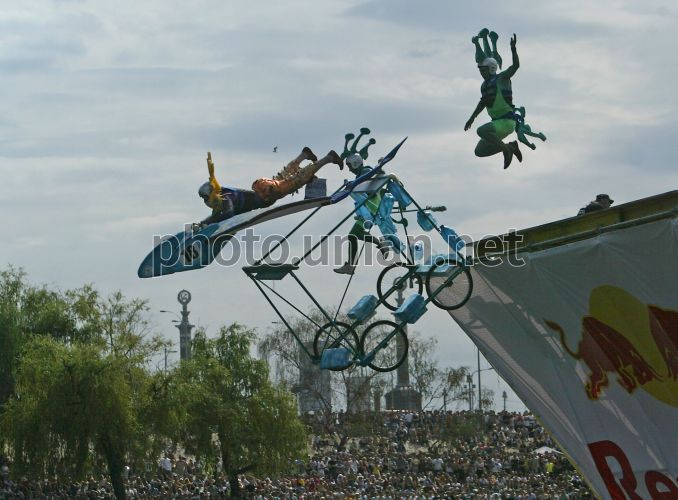 Участники команды "Автомаксимом" во время 1-го турнира Red Bull Flugtag - День безумных полетов, в Киеве, в субботу, 19 июня 2010 г. Суть данного мероприятия состоит в том, что сначала все его участники сооружают себе безмоторный летательный аппарат и прыгают на нем с 6-ти метрового трамплина, тем самым, пытаясь взлететь и пролететь, как можно дальше своих соперников. Приземляются участники на воду. Фото Александра Синицы / УНИАН