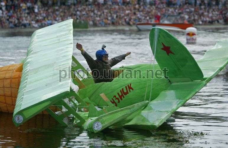 Участники команды ”Кузькина мать” во время 1-го турнира Red Bull Flugtag - День безумных полетов, в Киеве, в субботу, 19 июня 2010 г. Суть данного мероприятия состоит в том, что сначала все его участники сооружают себе безмоторный летательный аппарат и прыгают на нем с 6-ти метрового трамплина, тем самым, пытаясь взлететь и пролететь, как можно дальше своих соперников. Приземляются участники на воду. Фото Александра Синицы / УНИАН