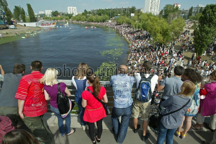 Зрители во время 1-го турнира Red Bull Flugtag - День безумных полетов, в Киеве, в субботу, 19 июня 2010 г. Суть данного мероприятия состоит в том, что сначала все его участники сооружают себе безмоторный летательный аппарат и прыгают на нем с 6-ти метрового трамплина, тем самым, пытаясь взлететь и пролететь, как можно дальше своих соперников. Приземляются участники на воду. Фото Александра Синицы / УНИАН