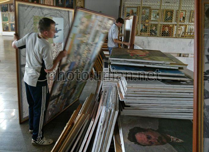 Работник «Украинского дома» убирает картины во время демонтажа выставки «Украинцы в мире», в Киеве, в среду, 7 июля 2010 г. Народный депутат Пётр Ющенко предлагает парламенту провести 7 июля слушания о роли и мерах государственной поддержки национальной галереи портретов выдающихся украинцев «Украинцы в мире», которой экс-Президент Виктор Ющенко присвоил статус национальной. Экспозиция выставки, открывшейся в июле 2008 года, насчитывает около 2 тыс. портретов. В декабре этого года в Верховной Раде состоятся парламентские слушания на тему «Украинцы в мире». За соответствующее постановление проголосовало 376 народных депутатов. Фото Александра Синицы / УНИАН