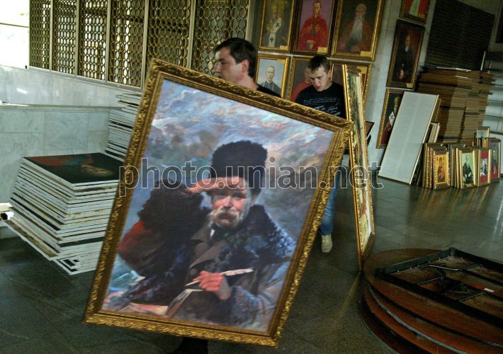 Работник «Украинского дома» выносит портрет ивыдающегося украинского писателя,поета и художника Тараса Шевченко во время демонтажа выставки «Украинцы в мире», в Киеве, в среду, 7 июля 2010 г. Народный депутат Пётр Ющенко предлагает парламенту провести 7 июля слушания о роли и мерах государственной поддержки национальной галереи портретов выдающихся украинцев «Украинцы в мире», которой экс-Президент Виктор Ющенко присвоил статус национальной. Экспозиция выставки, открывшейся в июле 2008 года, насчитывает около 2 тыс. портретов. В декабре этого года в Верховной Раде состоятся парламентские слушания на тему «Украинцы в мире». За соответствующее постановление проголосовало 376 народных депутатов. Фото Александра Синицы / УНИАН