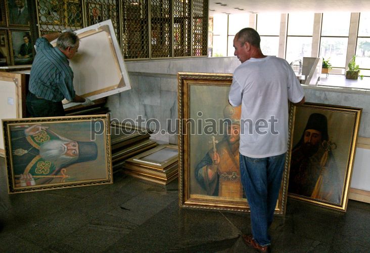 Работники «Украинского дома» убирают картины во время демонтажа выставки «Украинцы в мире», в Киеве, в среду, 7 июля 2010 г. Народный депутат Пётр Ющенко предлагает парламенту провести 7 июля слушания о роли и мерах государственной поддержки национальной галереи портретов выдающихся украинцев «Украинцы в мире», которой экс-Президент Виктор Ющенко присвоил статус национальной. Экспозиция выставки, открывшейся в июле 2008 года, насчитывает около 2 тыс. портретов. В декабре этого года в Верховной Раде состоятся парламентские слушания на тему «Украинцы в мире». За соответствующее постановление проголосовало 376 народных депутатов. Фото Александра Синицы / УНИАН