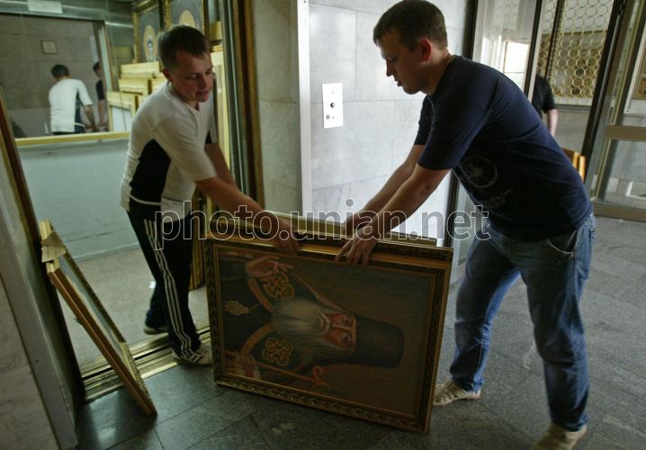 Работники «Украинского дома» убирают картины во время демонтажа выставки «Украинцы в мире», в Киеве, в среду, 7 июля 2010 г. Народный депутат Пётр Ющенко предлагает парламенту провести 7 июля слушания о роли и мерах государственной поддержки национальной галереи портретов выдающихся украинцев «Украинцы в мире», которой экс-Президент Виктор Ющенко присвоил статус национальной. Экспозиция выставки, открывшейся в июле 2008 года, насчитывает около 2 тыс. портретов. В декабре этого года в Верховной Раде состоятся парламентские слушания на тему «Украинцы в мире». За соответствующее постановление проголосовало 376 народных депутатов. Фото Александра Синицы / УНИАН