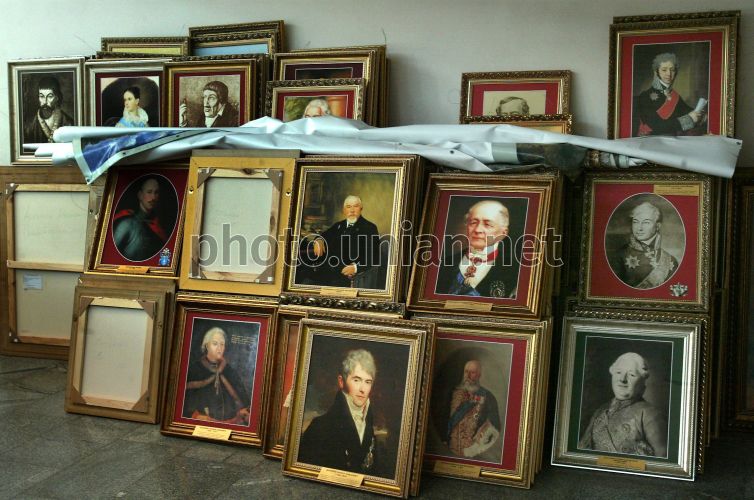 Портреты выдающихся украинцев «Украинцы в мире» после демонтажа выставки, в «Украинском доме», в Киеве, в среду, 7 июля 2010 г. Народный депутат Пётр Ющенко предлагает парламенту провести 7 июля слушания о роли и мерах государственной поддержки национальной галереи портретов выдающихся украинцев «Украинцы в мире», которой экс-Президент Виктор Ющенко присвоил статус национальной. Экспозиция выставки, открывшейся в июле 2008 года, насчитывает около 2 тыс. портретов. В декабре этого года в Верховной Раде состоятся парламентские слушания на тему «Украинцы в мире». За соответствующее постановление проголосовало 376 народных депутатов. Фото Александра Синицы / УНИАН
