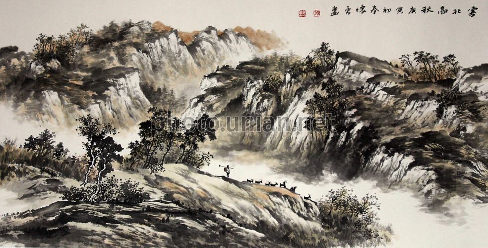Картина мастера восточной живописи Чанг Хуай Йонга на открытии выставки, в Киеве, в среду, 28 июля 2010 г. Китайская живопись отличается от западной не столько набором технических средств, сколько принципиально отличным художественным языком, более условным и декоративным. Пейзажный мир называют в Китае жанром «Горы и Воды». С древности китайцы поклонялись горам и водам как святыням. В китайских пейзажах горы считались олицетворением мужского начала Ян, и воды как женского начала Инь. Из взаимодействия Ян и Инь, по древним представлениям, возникает Вселенная и ее неотъемлемым элементом является человек. Жанр «Горы и Воды» - это олицетворение единства человека и природы. Мастер восточной живописи также проведет в Киеве обучающий курс по китайской живописи. Фото Александра Синицы / УНИАН