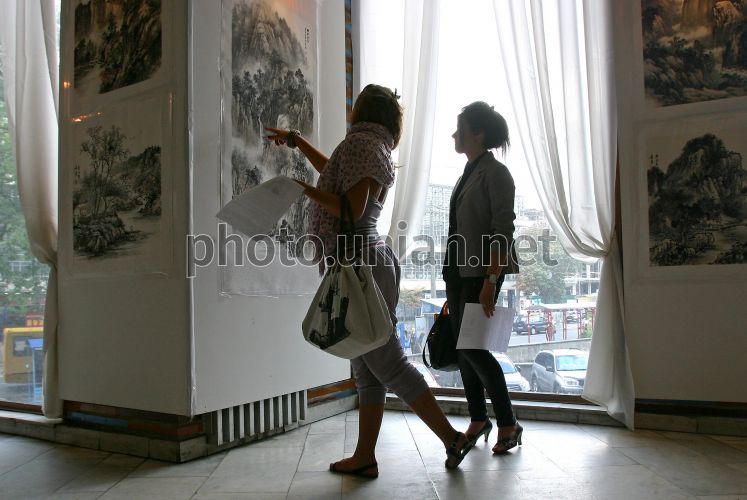 Посетители рассматривают картины на открытии выставки мастера восточной живописи Чанг Хуай Йонга, в Киеве, в среду, 28 июля 2010 г. Китайская живопись отличается от западной не столько набором технических средств, сколько принципиально отличным художественным языком, более условным и декоративным. Пейзажный мир называют в Китае жанром «Горы и Воды». С древности китайцы поклонялись горам и водам как святыням. В китайских пейзажах горы считались олицетворением мужского начала Ян, и воды как женского начала Инь. Из взаимодействия Ян и Инь, по древним представлениям, возникает Вселенная и ее неотъемлемым элементом является человек. Жанр «Горы и Воды» - это олицетворение единства человека и природы. Мастер восточной живописи также проведет в Киеве обучающий курс по китайской живописи. Фото Александра Синицы / УНИАН