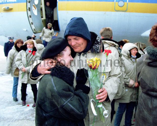 Врач-анестезиолог поисково-спасательного отряда Министерства по вопросам чрезвычайных ситуаций Украины Сергей Борщев (в центре) обнимает свою жену после возвращения отряда из Индии в киевском аэропорту Борисполь в понедельник, 26 февраля 2001г. Поисково-спасательный отряд проработал с 3 по 25 февраля в окрестностях г. Бхачау, оказывая медицинскую помощь пострадавшим в результате серии землетрясений, произошедших 26 и 28 января. С момента прибытия отряд оказал медицинскую помощь 5 тыс. 482 пострадавшим.