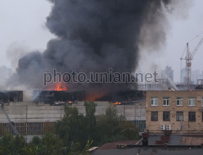 Столб дыма от пожара над заводом ”Веркон” (бывший ОАО ”Киевский станкостроительный концерн”, ”Завод станков-автоматов им. Горького”) в Киеве, в воскресенье, 15 августа 2010 г. В этот день вечером на территории завода раздался взрыв, после которого на заводе начался пожар. Фото Виталия Наталухи / УНИАН