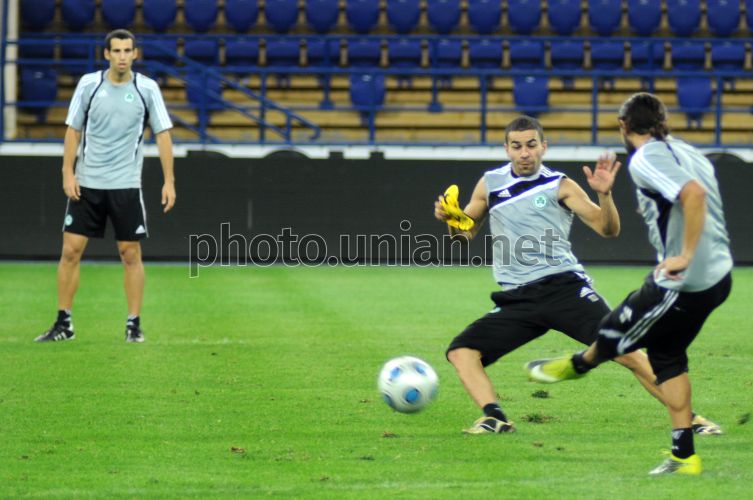 Игроки ФК ”Омония” (Никосия, Кипр) во время открытой тренировки, в Харькове, в среду, 25 августа 2010. 26 августа в Харькове пройдет матч плей-офф раунда Лиги Европы по футболу между ФК ”Омония” (Никосия, Кипр) и ФК ”Металлист” (Харьков). Фото Игоря Чекачкова / УНИАН