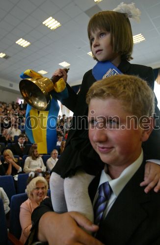 Первоклассница звонит в колокольчик во время торжественной линейки, в Киеве, в среду, 1 сентября 2010 г. Впервые за парты сядут 405,5 тыс. первоклассников. Всего же, по словам главы Минобразования, в школу пойдут более 4,3 млн учеников. В киевские школы в этот день отправятся 26 тыс. первоклассников. Всего в столице за парты сядут 226 тыс. учеников. Фото Александра Синицы / УНИАН