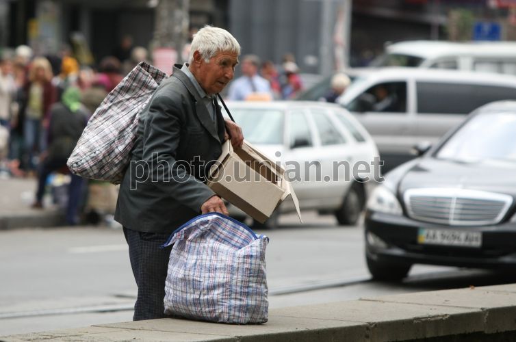 Пожилой мужчина несёт сумки, в Киеве, в понедельник, 13 сентября 2010 г. За август 2010 г. резкое повышение цен коснулось некоторых продуктов питания. Гречка, хлеб, молоко и картофель подорожали на 15-20%. До конца года некоторые продукты питания могут подорожать еще на 20-25%. Фото Владимира Гонтара / УНИАН