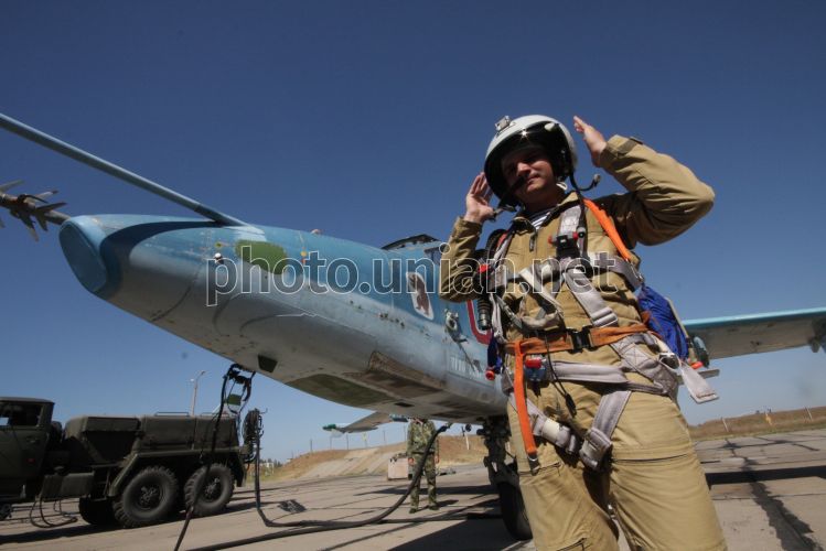 Летчик палубной авиации Северного флота ВМФ России возле самолета на полигоне взлетно-посадочных систем «Нитка», в поселке Новофедоровка (Крым), в среду, 15 сентября 2010 г. Полигон взлетно-посадочных систем «Нитка» создан в 1980 году для тренировок летного состава корабельной авиации и проведения испытаний авиационной и другой техники, которая используется для обеспечения посадки летательных аппаратов на палубу авианосцев. Согласно подписанному в 1997 году Соглашению между правительствами Украины и Российской Федерации, полигон «Нитка» с 2001 года используется российской стороной. В 2005 году директивой министра обороны Украины полигон «Нитка» был подчинен командованию ВМС Украины. В 2006 и в 2008-2009 годах полеты российских морских летчиков на нем не проводились. Фото Алексея Сувирова / УНИАН