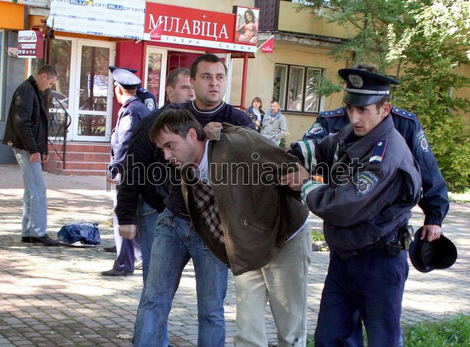 Сотрудники милиции задерживают бывшего директора Закарпатского облмуздрамтеатра Анатолия Рошко во время анонсированной последним акции по поводу разбивания витрин магазинов, в Ужгороде, в воскресенье, 3 октября 2010 г. Бывший директор Закарпатского облмуздрамтеатра Анатолия Рошко днями на одном из закарпатских сайтов анонсировал акцию по разбиванию витрин магазинов по Проспекту Свободы в Ужгороде. Акция была направлена против бездеятельности ужгородской милиции, которая не реагирует на неоднократные проявления вандализма в Ужгороде. Во время акции Анатолий Рошко вынул из пакета кирпич и упустил его на землю, после чего был задержан милиционерами. Среди вещдоков был найден кирпич из поролона. Ни одна из витрин ужгородских магазинов не пострадала. Фото Яноша Немеша / УНИАН