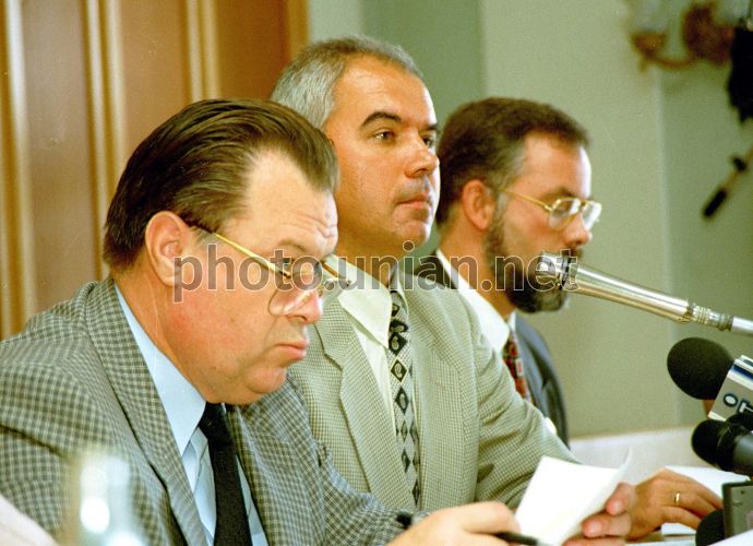 Глава пресс-центра центрального общественного избирательного штаба Леонида Кучмы Михаил Дорошенко (в центре) и его заместители народный депутат Дмитрий Табачник (направо) и академик Иван Курас ведут первую пресс-конференцию штаба в Киеве 27 августа 1999 г. "Избирательная программа кандидата в президенты Украины Леонида Кучмы отличается существенно от других кандидатских программ в первую очередь, тем, что она является программой действующего Президента, - отметил на пресс-конференции Михаил Дорошенко. - Она имеет отчетную часть, в которой отмечено все, что сделано за пять лет президентства Л.Кучми, и его видение перспективы по ключевым направлениям".