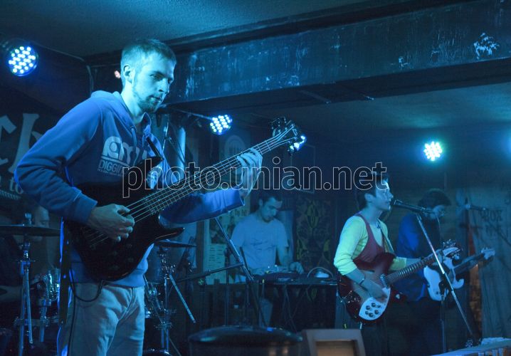 Участники российской рок-группы «Сурганова и оркестр», слева направо: бас-гитарист Денис Сусин, вокалистка и гитаристка Светлана Сурганова и гитарист Валерий Тхай выступают во время концерта, в Киеве, в среду, 13 октября 2010 г. Фото УНИАН