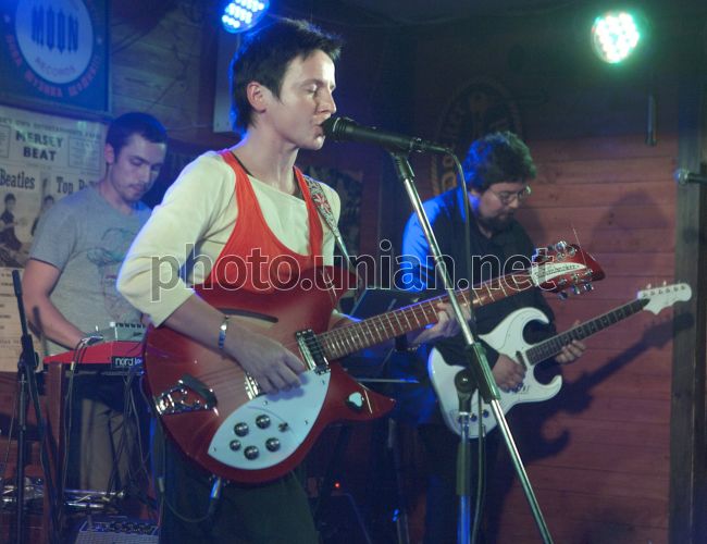 Участники российской рок-группы «Сурганова и оркестр»: вокалистка и гитаристка Светлана Сурганова, и гитарист Валерий Тхай, справа, на заднем плане, выступают во время концерта, в Киеве, в среду, 13 октября 2010 г. Фото УНИАН