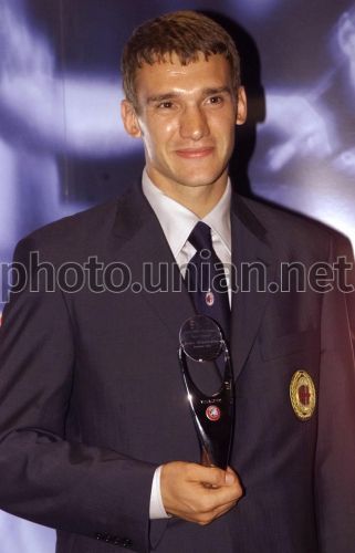 Украинский футболист Андрей Шевченко, играющий сейчас за команду "Милан", держит памятную награду лучшего нападающего УЕФА, 26 августа 1999 г. после церемонии награждения в Монако. Андрей Шевченко, который, как ожидалось, официально дебютирует в составе "Милана" уже в 1-м туре первенства, во вторник 25 августа травмировал ногу в товарищеском матче с мадридским "Реалом" (в котором "Милан" к тому же потерпел поражение 2:4). Врачи говорят, что его участие в гостевой воскресной встрече с "Лечче" представляется им проблематичным.