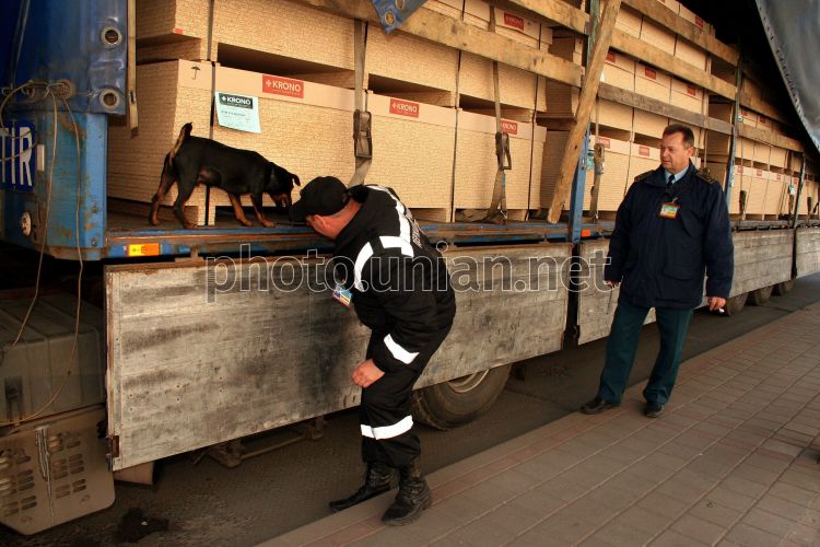Военнослужащий Чопского пограничного отряда со служебной собакой и работник таможенной службы проверяют груз на предмет контрабанды на территории грузового терминала на международном пункте пропуска для железнодорожного сообщения, в Чопе (Закарпатская область), в четверг, 14 октября 2010 г. Фото Яноша Немеша / УНИАН