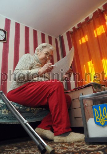 Пожилая женщина рассматривает бюллетень во время голосования на дому, в пгт. Песочин, Харьковской обл., в воскресенье, 31 октября 2010 г. В этот день в Украине проходят выборы депутатов Верховной Рады Крыма, местных советов и сельских, поселковых, городских председателей. Избирательная кампания стартовала 11 сентября. Выборы проходят по мажоритарно-пропорциональной системе: 50% депутатов избираются по партийным спискам, 50% – в мажоритарных округах. Участие в местных выборах блоков партий не предусмотрено. Граждане Украины избирают всех без исключения сельских, поселковых и городских председателей, сельских, поселковых, городских, районных в городе и областных советов, кроме киевского городского председателя, Киевского городского совета и Тернопольского областного совета, поскольку они были избраны на внеочередных выборах. За местными выборами наблюдают 1913 официальных наблюдателей от всеукраинских общественных организаций. Кроме того, наблюдают за выборами 134 официальных наблюдателя от иностранных государств и 356 официальных наблюдателей от международных организаций. При этом депутат от Партии регионов, заместитель председателя комитета Рады по иностранным делам уверен, в том, что для осуществления объективного контроля международным организациям необходимо иметь минимум 24 тысячи представителей (по 2 на каждый избирательный участок). Фото Владимира Андреева / УНИАН