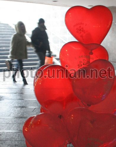 Молодые люди проходят возле надувных шариков в виде сердец в центре Киева во вторник, 14 февраля 2006 г. 14 февраля во всех странах мира отмечается День Святого Валентина. В этот день влюбленные дарят друг другу подарки в форме сердец, символизирующих любовь. Фото Александра Синицы / УНИАН