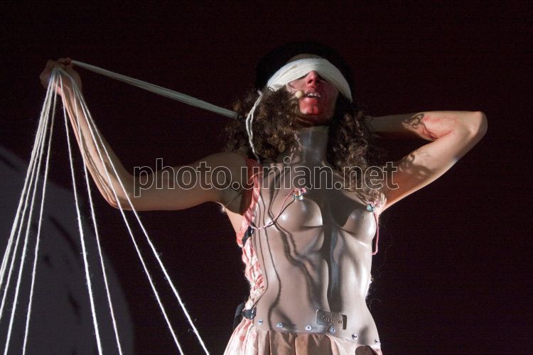 Российская актриса Илона Маркарова в роли Медеи с завязанными глазами во время панк-оперы «Медея. Эпизоды», в Киеве, в субботу, 13 ноября 2010 г. Отталкиваясь от факта, что Еврипид приписал убийство детей Медее за взятку для очищения доброго имени Коринфа, культовый панк-поэт Лёха Никонов специально для спектакля ”Медея. Эпизоды” написал поэму «Медея», монологи из которой и составляют литературный дискурс спектакля. Фото УНИАН