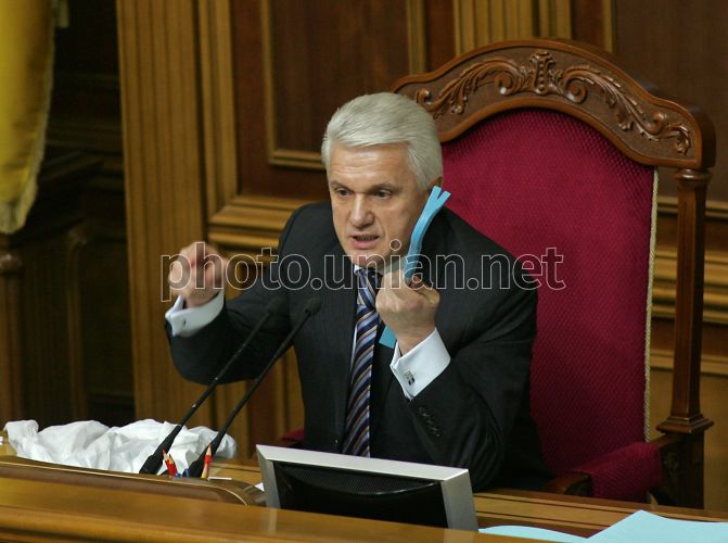 Председатель Верховной Рады Украины Владимир Литвин во время заседания Верховной Рады Украины в Киеве, в пятницу, 17 декабря 2010 г. Депутаты фракции Блока ”Наша Украина-Народная Самооборона” и ”Блок Юлии Тимошенко-Батьківщина” в Верховной Раде покинули зал пленарных заседаний парламента. Депутаты забрали свои электронные карты голосования и вышли из зала во время выступления председателя фракции Партии регионов Александра Ефремова. На рабочих местах сектора фракции БЮТБ депутаты зажгли свечи. Утром фракция ПР блокировала трибуну парламента, однако позднее Рада открыла свое утреннее пленарное заседание. В повестке дня парламента на пятницу заслушивание в рамках ”часа вопросов к Кабинету Министров” информацию министра финансов Федора Ярошенко о проверке эффективности использования бюджетных средств их распорядителями в период с 2008 по март 2010 года. Запланировано также заслушивание отчета временной следственной комиссии по вопросам выяснения обстоятельств использования бюджетных средств руководством Государственного агентства резерва. Фото Александра Синицы / УНИАН