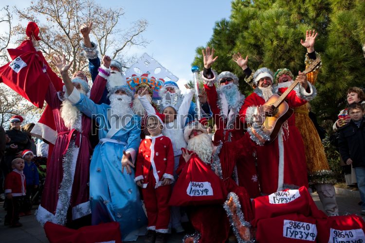 Участники шествия Дедов Морозов ”Мороз-парад” из Гурзуфа, в Ялте (Крым), в субботу, 25 декабря 2010 г. Парад Дедов Морозов стартовал от театра Чехова и прошел торжественным шествием по набережной. В рамках праздника выступили музыкальные и танцевальные коллективы, а шествие сопровождал городской оркестр. Принять участие в ”Мороз-параде” мог каждый. При этом главным условием было наличие костюма Деда Мороза. Представители Книги рекордов Украины зарегистрировали установление рекорда Украины в категории ”Массовые мероприятия” - самый многочисленный парад Дедов Морозов на Южном Берегу Крыма. Фото Сергея Титова / УНИАН