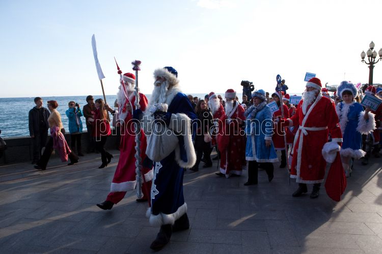 Участники шествия Дедов Морозов ”Мороз-парад” проходят по набережной, в Ялте (Крым), в субботу, 25 декабря 2010 г. Парад Дедов Морозов стартовал от театра Чехова и прошел торжественным шествием по набережной. В рамках праздника выступили музыкальные и танцевальные коллективы, а шествие сопровождал городской оркестр. Принять участие в ”Мороз-параде” мог каждый. При этом главным условием было наличие костюма Деда Мороза. Представители Книги рекордов Украины зарегистрировали установление рекорда Украины в категории ”Массовые мероприятия” - самый многочисленный парад Дедов Морозов на Южном Берегу Крыма. Фото Сергея Титова / УНИАН