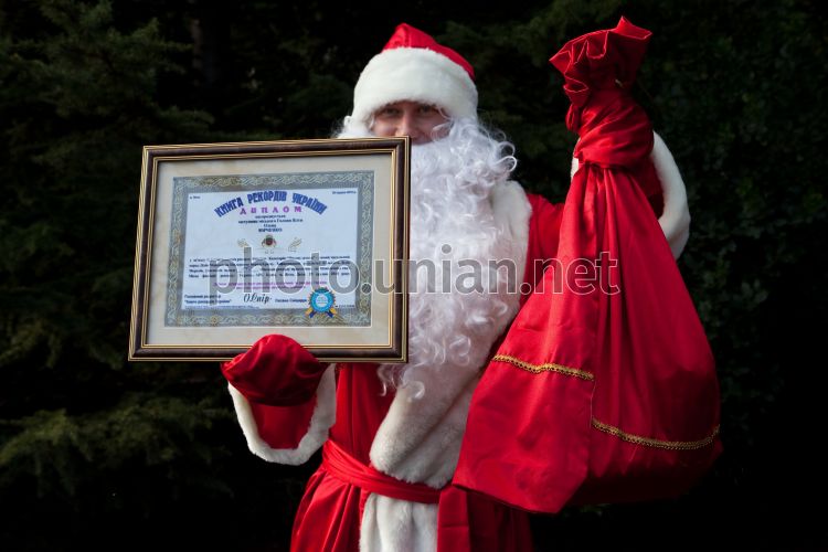 Участник шествия Дедов Морозов "Мороз-парад" держит диплом, подтверждающий установление рекорда Украины в категории "Массовые мероприятия" - самый многочисленный парад Дедов Морозов на Южном Берегу Крыма, в Ялте (Крым), в субботу, 25 декабря 2010 г. Парад Дедов Морозов стартовал от театра Чехова и прошел торжественным шествием по набережной. В рамках праздника выступили музыкальные и танцевальные коллективы, а шествие сопровождал городской оркестр. Принять участие в "Мороз-параде" мог каждый. При этом главным условием было наличие костюма Деда Мороза. Представители Книги рекордов Украины зарегистрировали установление рекорда Украины в категории "Массовые мероприятия" - самый многочисленный парад Дедов Морозов на Южном Берегу Крыма. Фото Сергея Титова / УНИАН