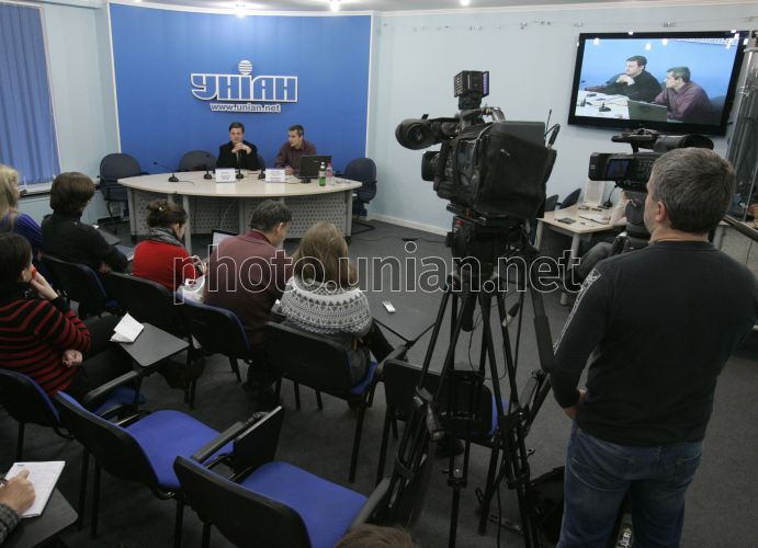 Слева направо на дальнем плане - представитель профессора Юрия Лысенко, избранного на должность ректора Донецкого национального университета, журналист Даниил Чикин и представитель и.о. ректора Донецкого Национального Университета Петра Егорова журналист Тимофей Златкин во время пресс-конференции в УНИАН на тему: «Война за университет: возможно ли перемирие?», в Киеве, в среду, 12 января 2011 г. Обсуждалась ситуация, сложившаяся вокруг выборов ректора Донецкого Национального университета. Скандал, разгоревшийся в середине декабря, поставил под угрозу не только репутацию одного из ведущих ВУЗов Украины, но и украинскую систему высшего образования в целом. Происходящее носит все признаки рейдерского захвата, жертвой которого может стать еще не одно учебное заведение. 10 декабря конференция трудового коллектива Донецкого национального университета избрала Юрия Лысенко для утверждения Министерством образования, науки, молодёжи и спорта на должности ректора ВУЗа. 17 декабря Окружной административный суд Киева признал незаконным избрание ректора Донецкого национального университета и запретил Минобразования заключать контракт с победителем. Д.Чикин заявил, что ему звонили по телефону неизвестные, которые представлялись работниками облгосадминистрации, и рекомендовали воздержаться от освещения темы выборов ректора ДонНУ. “Если победитель выборов ректора будет нежелателен для Министерства образования или каких-то групп влияния, то не исключено, что будут уголовные дела, что не будут происходить новые звонки в редакции газет, не исключено, что будут новые судебные процессы от непонятных фигурантов... Если эта проблема не будет решена по закону, то система высшего образования Украины может попрощаться со своей самостоятельностью”, - убеждён Чикин. Он напомнил, что Киевский окружной административный суд рассматривает дело по иску еще одного кандидата в ректоры ДонНУ Александра Корыстина, который обратился в суд, поскольку его кандидатура, вопреки закону «О высшем образовании», якобы противозаконно не была представлена на выборах ректора ДонНУ. Рассмотрение дела назначено на 25 января, и пока действие решения о результатах выборов нового ректора приостановлено до вынесения решения суда по иску А.Корыстина. Третьей стороной в суде назначен П.Егоров, исполняющий обязанности ректора ДонНУ. Во время пресс-конференции донецкие журналисты призвали своих коллег следить за событиями вокруг выборов ректора ДонНУ и проверять информацию на эту тему. Фото Андрея Скакодуба / УНИАН