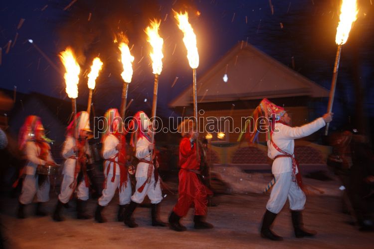 Ряженые участники колядного карнавала во время национального обряда ”Колядные цари” в деревне Семежево (Минская область, Беларусь), в четверг, 13 января 2011 г. Каждый год на Щедрый вечер в ночь с 13 на 14 января, группа из молодых мужчин – «царей» – с песнями и плясками проходят по деревне, посещают дома односельчан и разыгрывают действие о Царе Максимилиане. За это хозяева щедро одаривают гостей. Этот народный обряд зародился в XVIII веке, но сохранился только в деревне Семежево. В нём участвуют только молодые мужчины и юноши, которых и называют «царями». С наступлением темноты ”цари” зажигают факелы. Этот обряд входит в Список нематериального культурного наследия ЮНЕСКО. Фото Сергея Костина / УНИАН